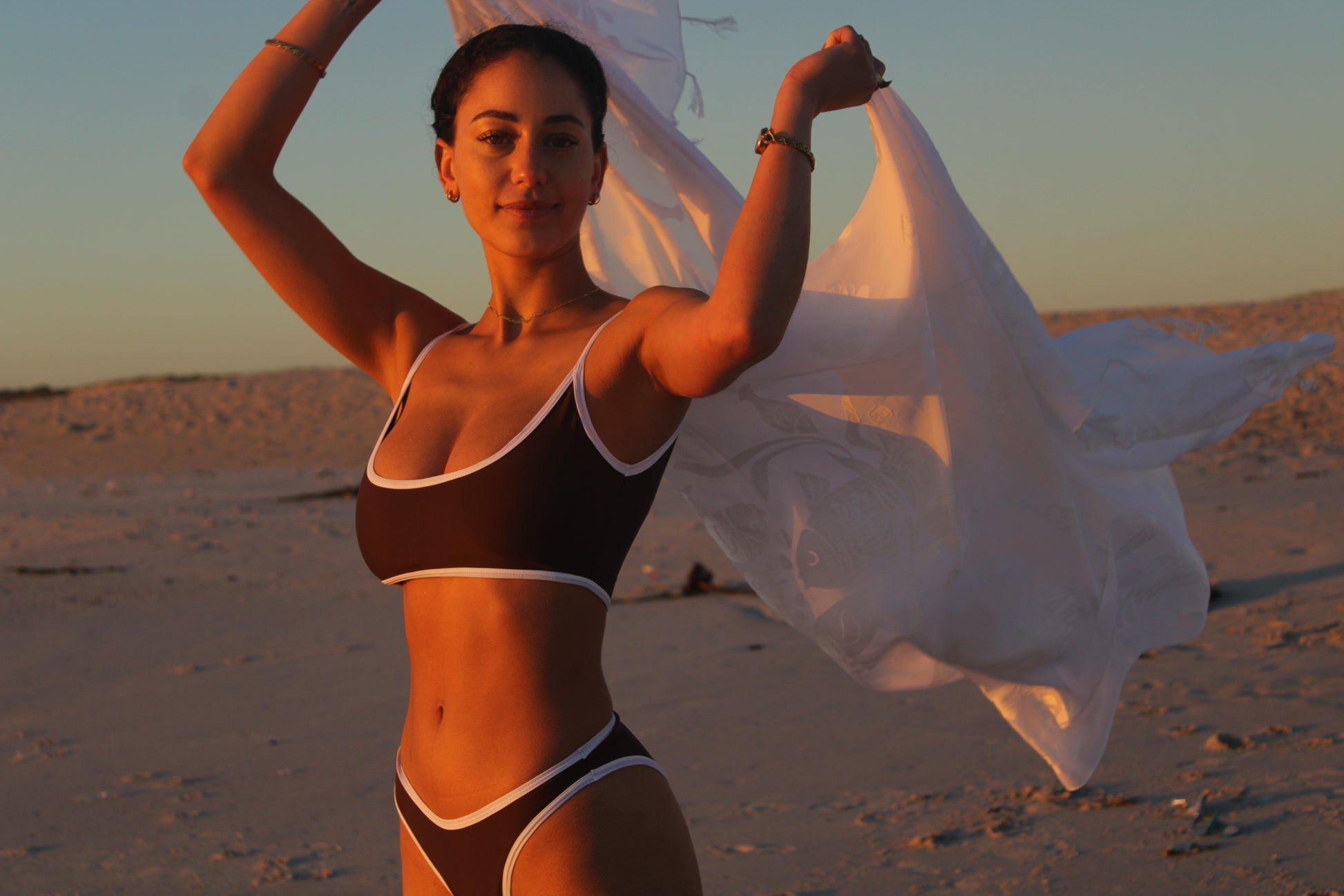 Our gorgeous amphitrite set in the color earth, was designed for our surfer, sporty girls in mind that love a little cheeky bottom but with a slight taste of elegance and coverage. Designed with a high rise cheeky Brazilian bottom and open back top.